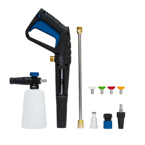 пистолет−распылитель, армированный шланг высокого давления с катушкой, комплект быстросъемных насадок−форсунок (4 шт), насадка на пистолет грязевая фреза, кронштейн−держатель сетевого шнура, пеногенератор, быстросьемный коннектор, фильтр для очистки воды, игла для чистки насадки высокого давления, руководство по эксплуатации
