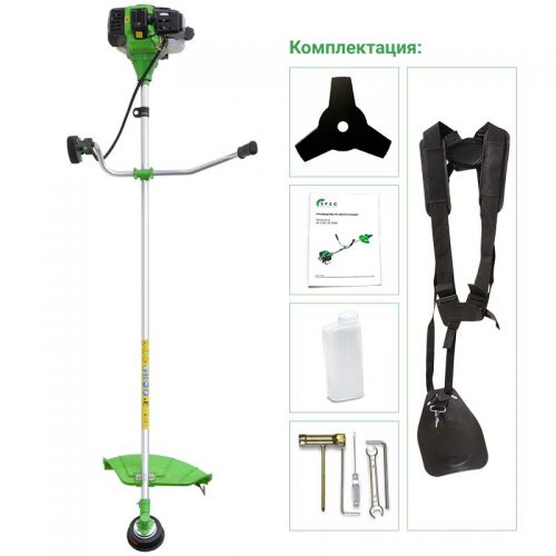 комплект болтов для сборки, два шестигранных ключа, комбинированная отвёртка, косильная головка, трёхлопастной нож, двуплечный ремень, емкость для подготовки топливной смеси, инструкция по эксплуатации с гарантийным талоном