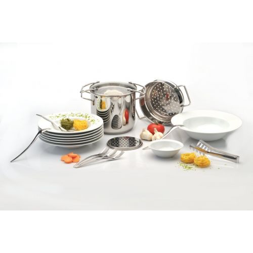 6 x Тарелка для макарон 27 см; 1 x Миска для салата 31 см; 1 x Миска для соуса 14 см; 1 x Терка с силиконовым кольцом 15 см; 6 x Вилка для макарон 21 см; 1 x Щипцы для макарон 27 см; 1 x Кастрюля для макарон с пароваркой и крышкой 20 см;