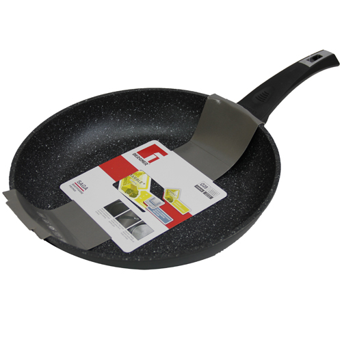 BG-8563 - сковорода от Bergner диаметром 28 см. Достаточно лёгкая сковорода, т.к. в её основе использован алюминий (литой). Покрытие антипригарное. В состав верхнего слоя этой модели добавлена мраморная крошка. Поэтому это самое стойкое покрытие, устойчивое к высоким температурам и царапинам. Производитель рекомендует использовать силиконовые или деревянные приборы. Такая сковородка прослужит Вам долгие годы. Нагрев происходит за короткое время. Довольно долго остаётся горячей. Обладает хорошей теплопроводимостью. Дно индукционное, поэтому тепло распределяется равномерно, и подходит для разных видов плит.