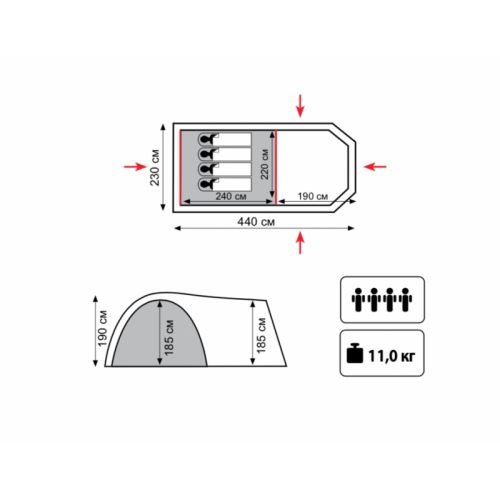 внешний тент имеет пропитку, задерживающую распространение огня, тент палатки оборудован юбкой, большое спальное отделение, съемный пол из терпаулинга в тамбуре